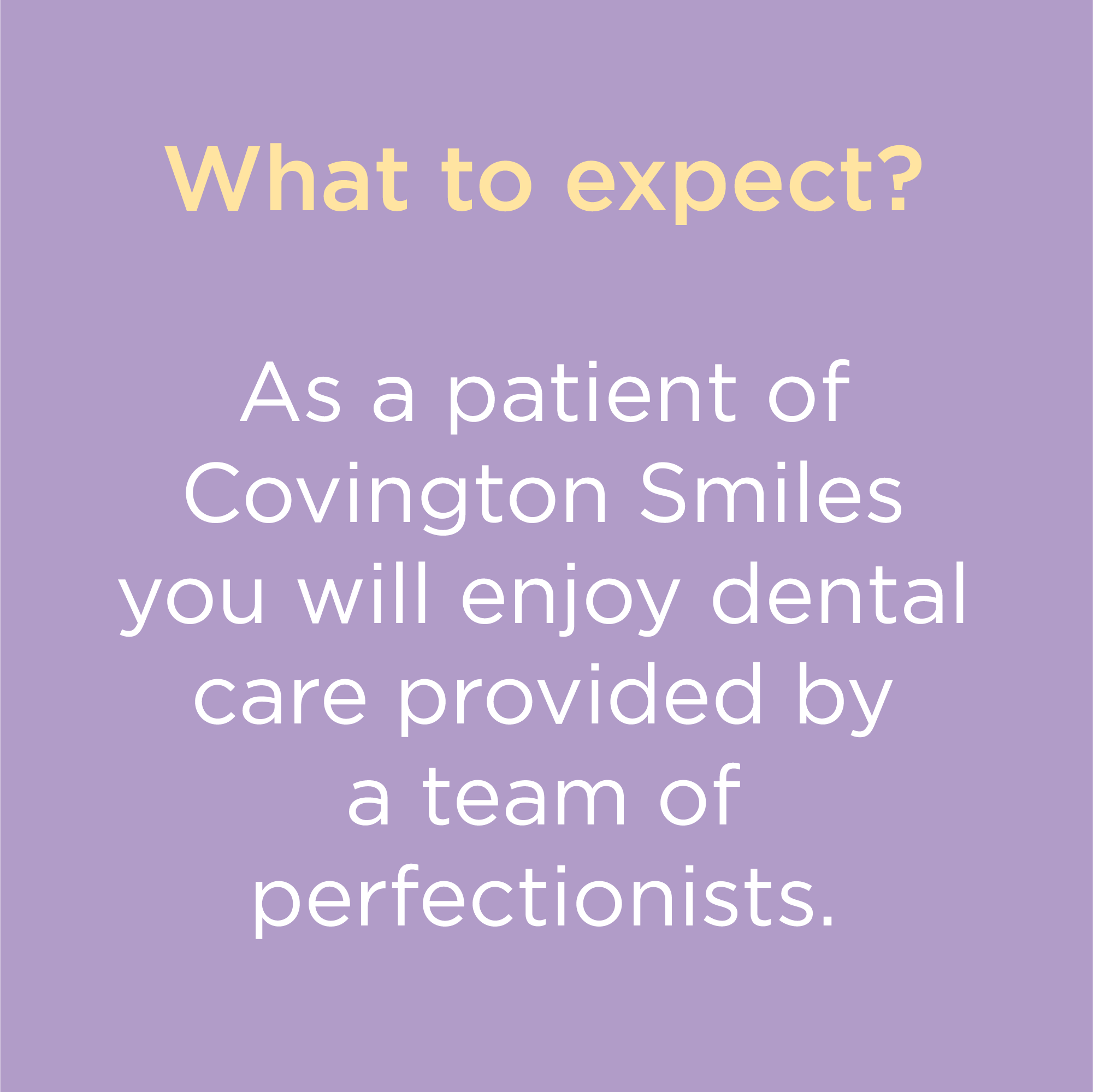 As a patient of Covington Smiles you will enjoy dental care provided by a team of perfectionists. When you choose Dr. Lee and his team of hygienists you get a group that is driven by perfection dentistry. Every detail of your care is considered. From the office setting, how you get along with your hygienist, your treatment plan, the aesthetics of every tooth, and clear communication about payment and insurance.